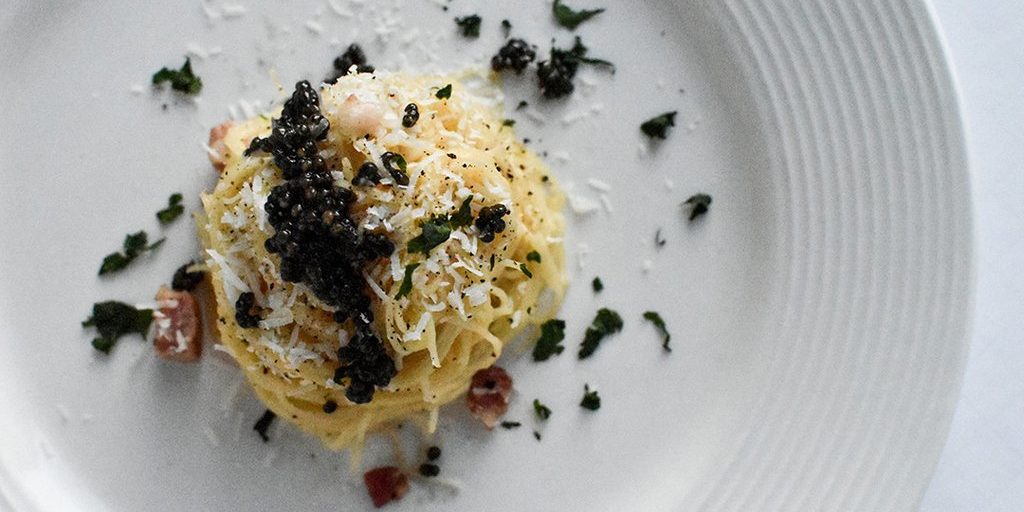 Meanwhile, make the carbonara: In a large bowl, beat the egg yolks with the whole egg, the cheese, lemon zest, 1/2 teaspoon of salt and 1 teaspoon of pepper. Very gradually whisk in 1/2 cup of the reserved hot pasta water to temper the eggs. Add the pasta and half the caviar and vigorously toss until hot and creamy, 1 to 2 minutes. Transfer to bowls and top with snipped dill and dollops of the remaining caviar.