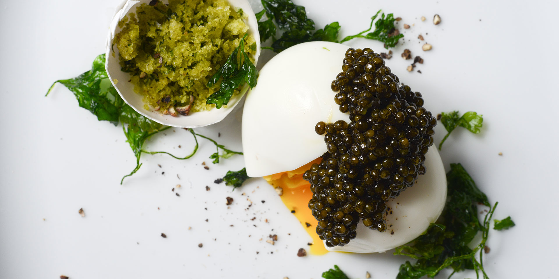 5. Starting at the large end of the egg, carefully crack and peel the shell. Place peeled eggs on a plate. Carefully cut each egg in half and top with a generous dollop of caviar, a sprinkling of gremolata, and salt and cracked pepper to taste.